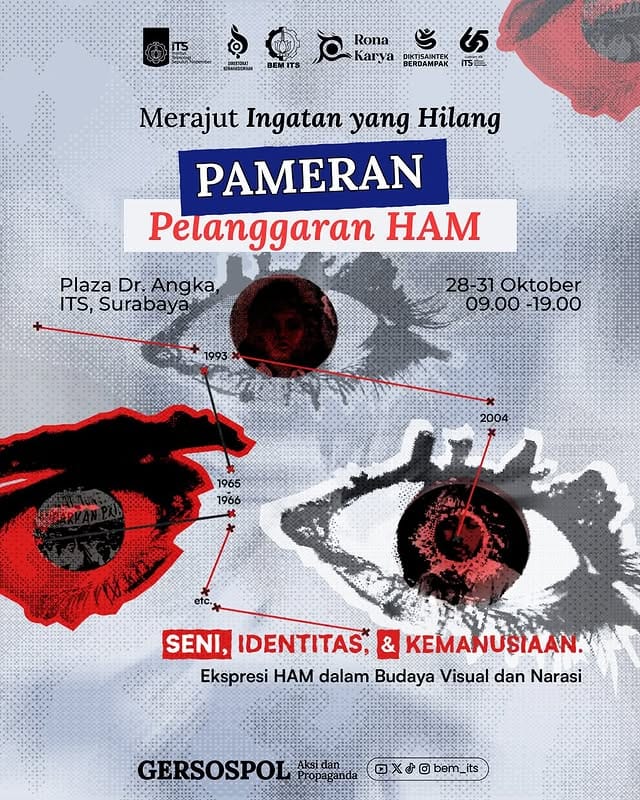 Melalui kekuatan seni, narasi visual, dan ruang kolaborasi lintas disiplin, pameran ini mengajak kita menelusuri kembali sejarah pelanggaran HAM di Indonesia — tidak hanya untuk mengenang, tetapi juga untuk menyuarakan nilai-nilai kemanusiaan yang semestinya dijaga. Diselenggarakan di Plaza Dr. Angka, ITS Surabaya, pada 28–31 Oktober 2025 pukul 09.00–19.00 WIB, pameran ini terbuka untuk umum dan menjadi wadah bagi siapa pun yang ingin belajar, memahami, dan berempati terhadap perjalanan panjang kemanusiaan di negeri ini.